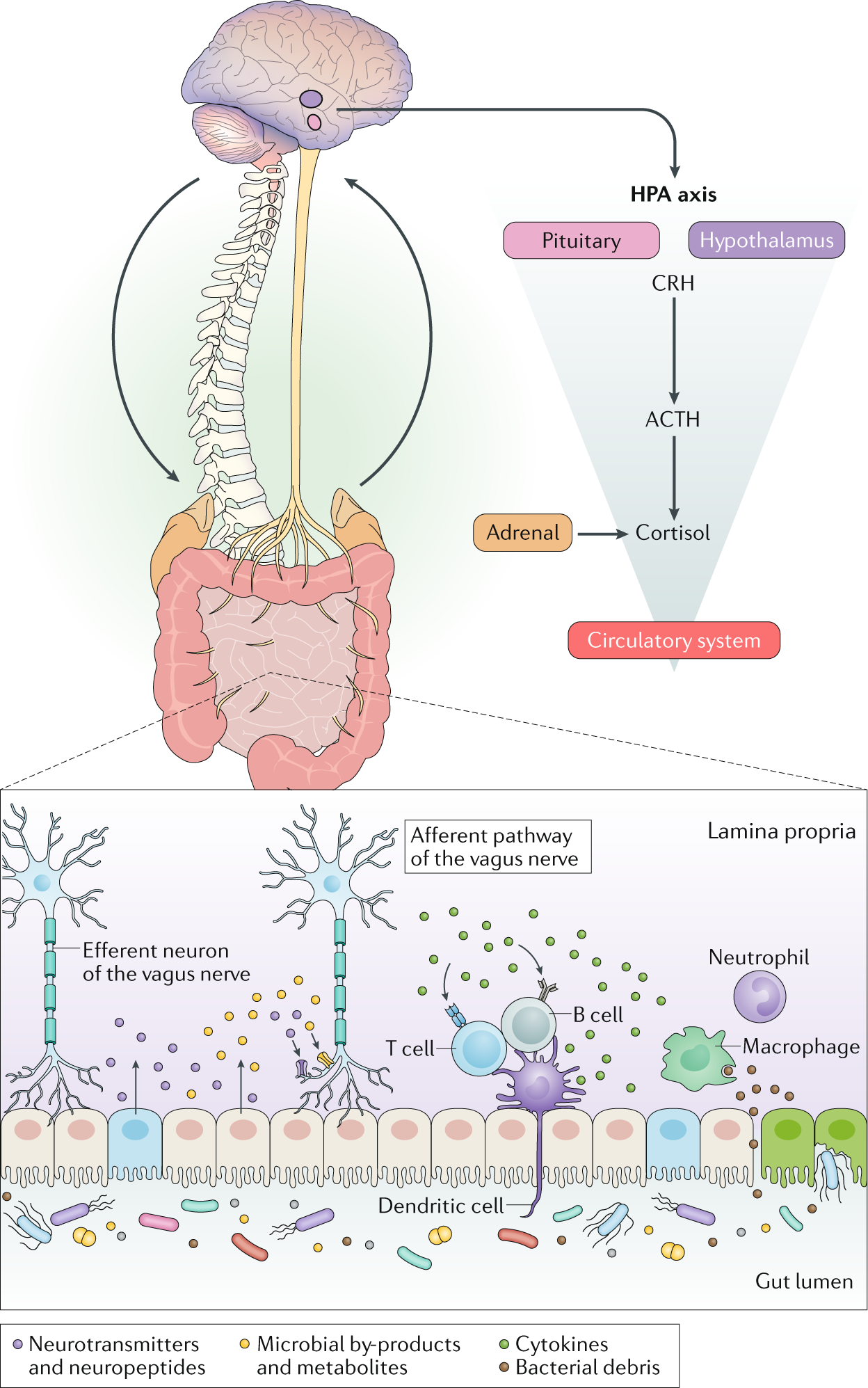 Gut microorganisms produce signaling molecules that influence immunity, inflammation, neurotransmitter synthesis, and metabolic regulation via the gut–brain axis.
